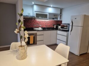 La cocina completamente equipada, horno y anafe eléctricos, microondas, heladera con freezer, cafetera, pava eléctrica, tostadora, juguera, minipimer y vajilla.