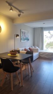 El departamento está completamente equipado, con muebles de líneas simples y colores que invitan a la tranquilidad.